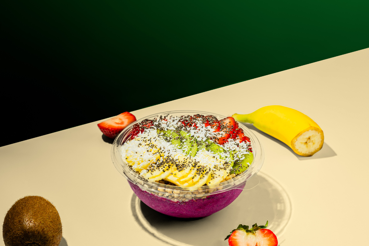 Bright, creamy, and full of tropical flavor! Made with organic unsweetened coconut milk, frozen banana, and organic dragon fruit, this colorful bowl is topped with organic gluten-free granola, strawberries, kiwi, pineapple, coconut curls, and a sprinkle of chia seeds. Refreshing and nutrient-packed — a true taste of the tropics in every bite.