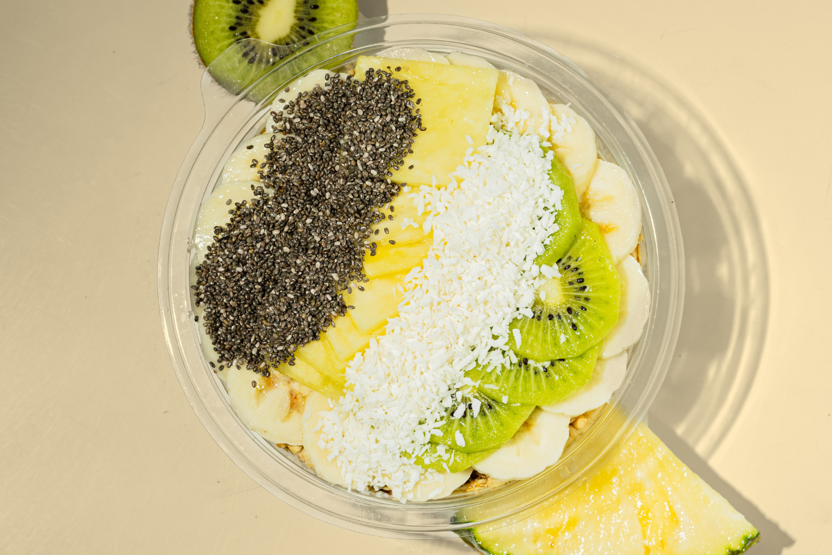 The acai base is made with fresh apple juice, acai and frozen banana. The apple juice brings out the sweetness and add a tart taste to the bowl. The toppings include Organic Granola, fresh cut banana, pineapple, kiwi and hemp seeds for extra protein.